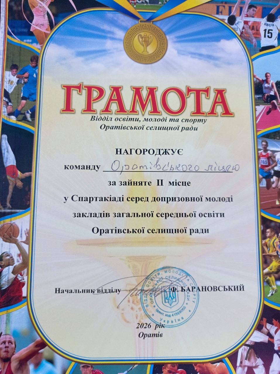 Команда Оратівського ліцею виборола ІІ місце у Спартакіаді серед допризовної молоді закладів загальної середньої освіти Оратівської селищної ради.